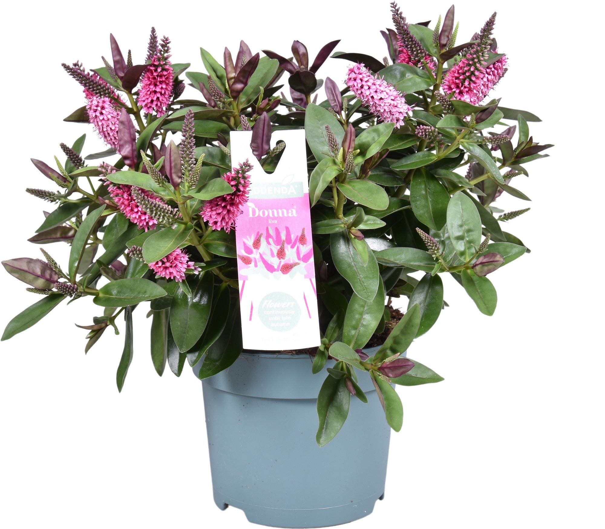 Questa Hebe, chiamata anche Veronica, è una varietà ibrida di pianta arbustiva ornamentale facile da coltivare in vaso e in piena terra nel giardino, apprezzata per il suo fogliame decorativo e per la sua prolungata e cospicua fioritura per tutto il periodo autunnale.
